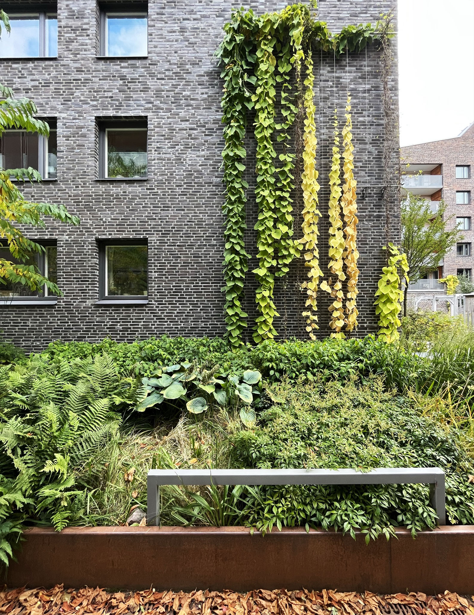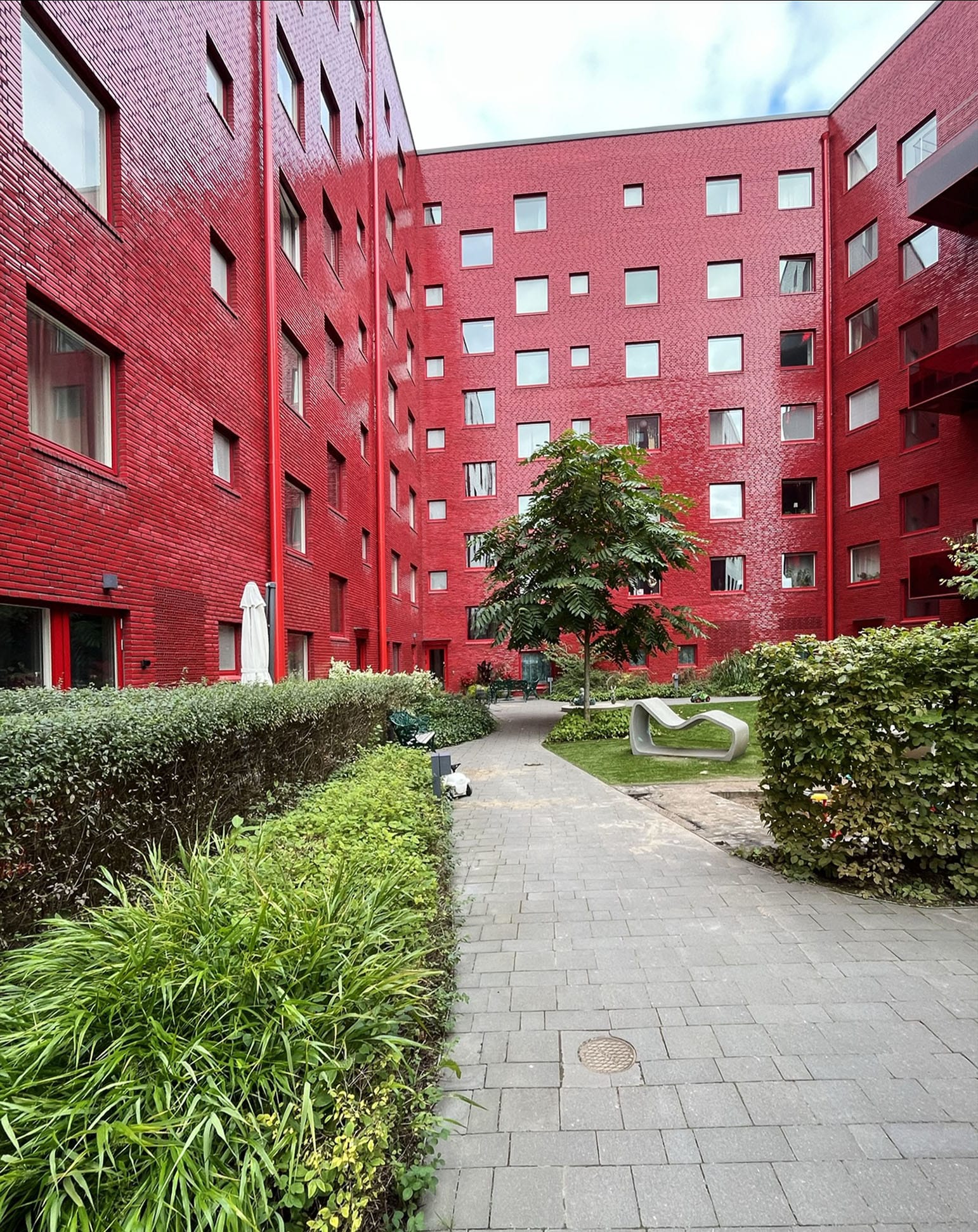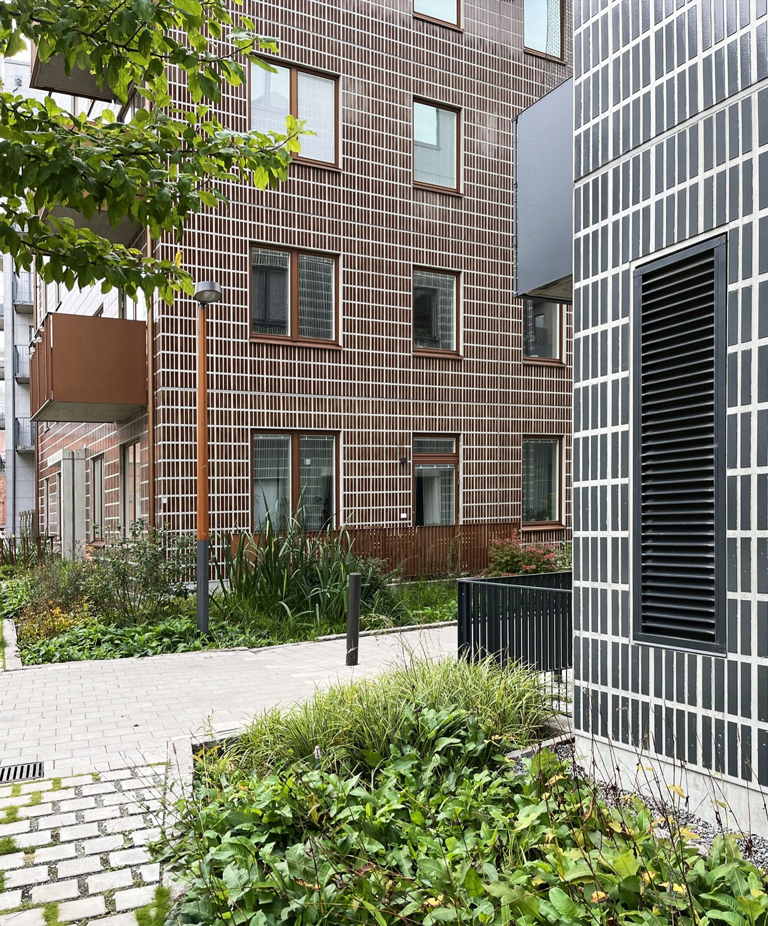 Laivamatkalla keskityimme tutustumaan toisiimme, syömään hyvin ja sulattelimme saamiamme tiili- ja betonirakentamisen oppeja. Perjantaiaamu valkeni raikkaana ja sää suosi koko päivän. Päivä aloitettiin räväkästi punaisilla lasitetuilla tiilillä muuratun Kvarteret Mudduksen luona. Norra Djurgårdstadenin asuinalue hurmasi meidät vehreydellään ja hienosti suunnitelluilla ja toteutetuilla yksityiskohdillaan. Alue on ennen ollut teollisuusaluetta, mutta sitä ei tänä päivänä huomaa – päinvastoin piha-alueet luovat upean kokonaisuuden arkkitehtuurin kanssa.